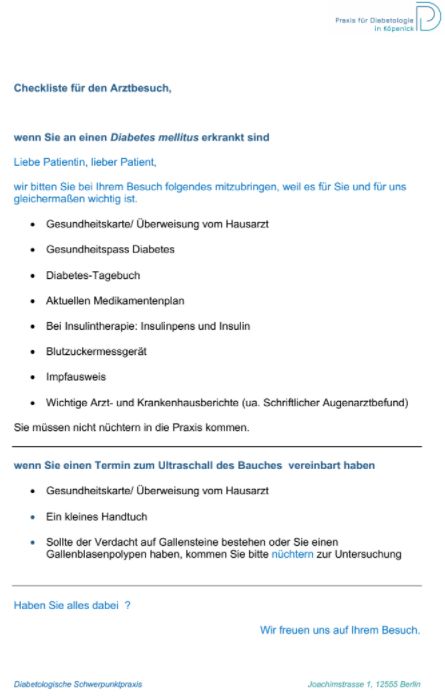 Versichertenkarte, Blutzuckertagebuch, Medikamentenplan, relevante Befunde.